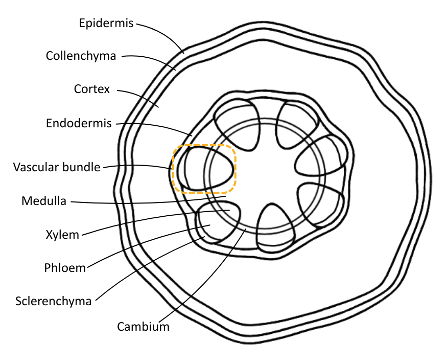 | Stem | Vascular bundles are arranged in a ring near the outer edge, with xylem on the inner side and phloem on the outer side. | ![]() |