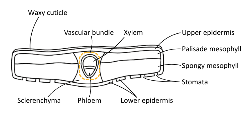| Leaf | Vascular tissue in the midrib and veins, with xylem above and phloem below in the bundle sheath. | ![]() |